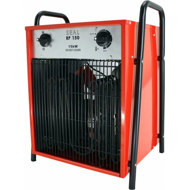 Seal RP 150 elektrische kachel. Draagbare elektrische heater, compacte en robuuste uitvoering. De Seal RP 150 elektrische kachel is geschikt voor gebruik in afgesloten ruimtes, bouwtoepassingen, industrie, scheepvaart ea. Twee- of drietraps verstelbare warmteopbrengst. De Seal RP 150 kachel is voorzien van een stille axiale ventilator en geisoleerde verwamingselementen met roestvrij stalen coating. Uitgerust met een ingebouwde kamerthermostaat en veiligheidsthermostaat.